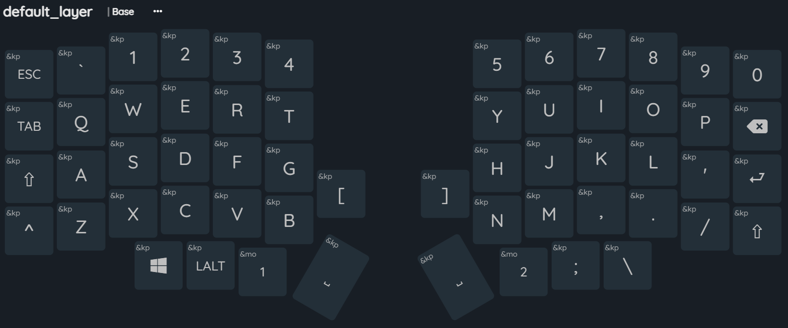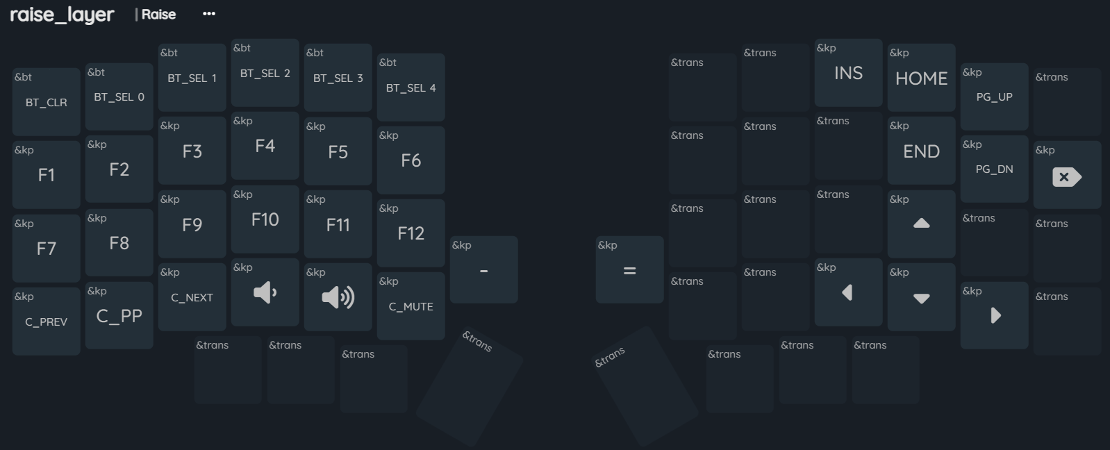 The Nice!Nano modules use ZMK firmware, which is an open source standard. I don’t really have a horse in the race between QMK/ZMK, but working with ZMK was super easy. I used the online keymap editor made by Nick Coutsos to generate it. My layout is fairly simple. I have most things available on the base layer, with a numpad, arrow keys, media keys, bluetooth settings, and function row available on the raise/lower layers. I’m not completely happy with it. Having the esc key in the number row isn’t great. My muscle memory is always off by one key in that row. I think it’s not the best layout, but I like it so far otherwise.